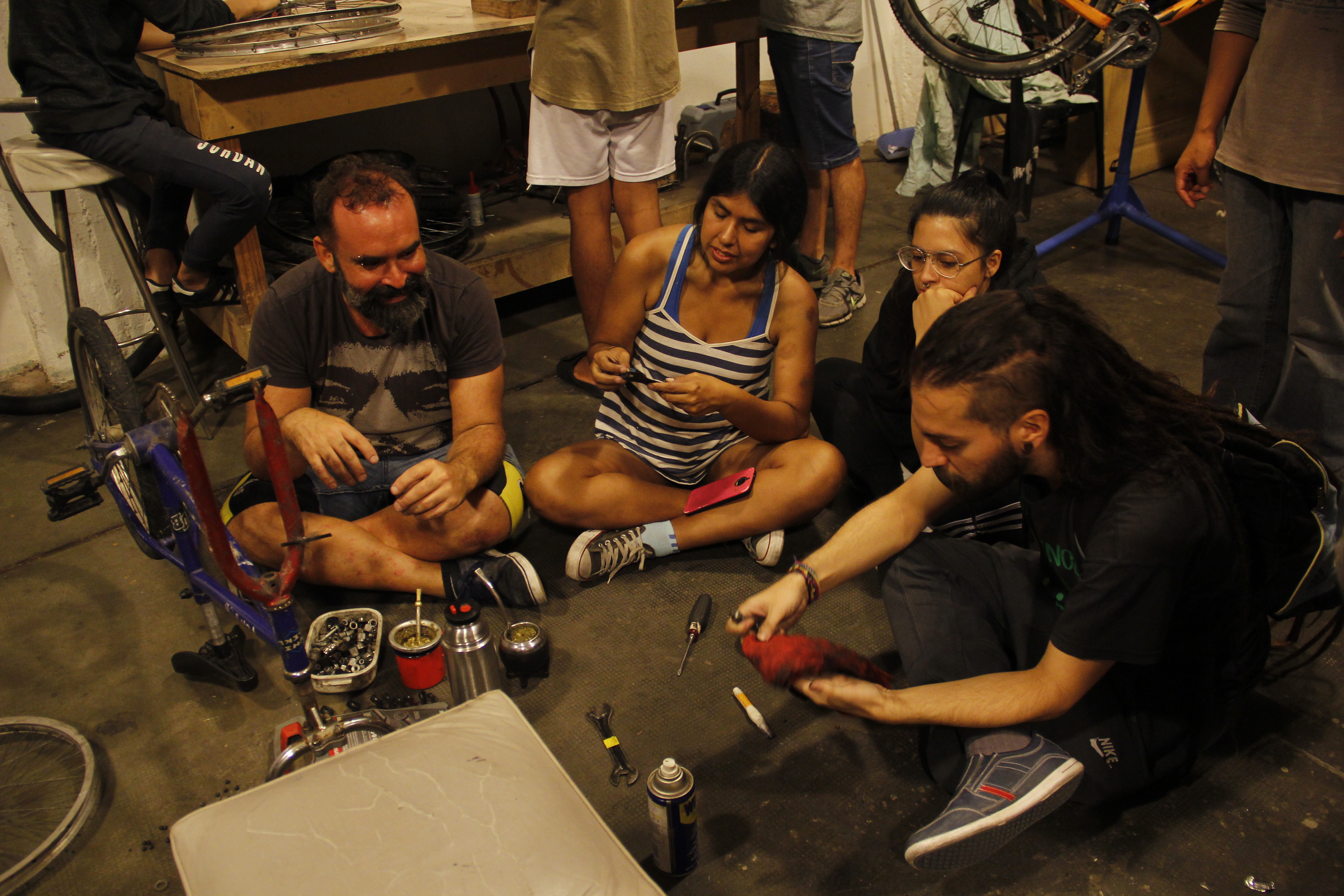 Invitamos a compartir, reparamos bicis colectivamente, nos ponemos, vemos, consultamos y lo sacamos adelante.